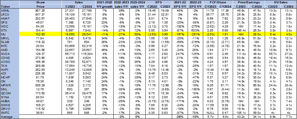 MU stock is cheap but doesn't provide a favorable risk-reward profile in the near term, given that the positives have already been factored into the stock price. On a P/E basis, the stock trades at 26.0x C2024 compared to the peer group of 34.1x. The stock is trading at 4.0x EV/C2024 Sales, comfortably lower than the peer group average of 7.7x. We like MU for longer-term investors but don't see the stock outperforming in the near term due to 1. the priced-in positives mentioned above and 2. a lack of a near-term catalyst quickening the pace of end demand recovery and triggering a new wave of investor confidence.