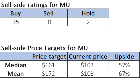 Wall Street's sentiment on the stock hasn't shifted too much this quarter, with the majority of sell-side analysts pushing for a buy. Of the 37 analysts covering the stock, 35 are buy-rated, and the remaining are hold-rated. Sell-side price targets on the stock also convey a similar positivity, with the median price target set at $161 and the mean at $172 for a potential upside of 57-67%. We don't see MU realizing this upside over the next quarter and, hence, would recommend investors stay on the sidelines for now. The following chart indicates MU stock's sell-side ratings and price targets.
