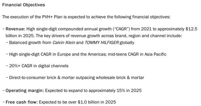 Fresh from its robust performance in 2021, which saw revenues grow by 28% and operating margin rise to ~11%, after a loss the year before, PVH released a new strategic roadmap, the PVH+ Plan. In financial terms, the plan had two targets. One, to reach a revenue of ~USD $12.5 billion in 2025 and two, expand operating margin to 15% by that period (see graphic below for more details on the plan).
