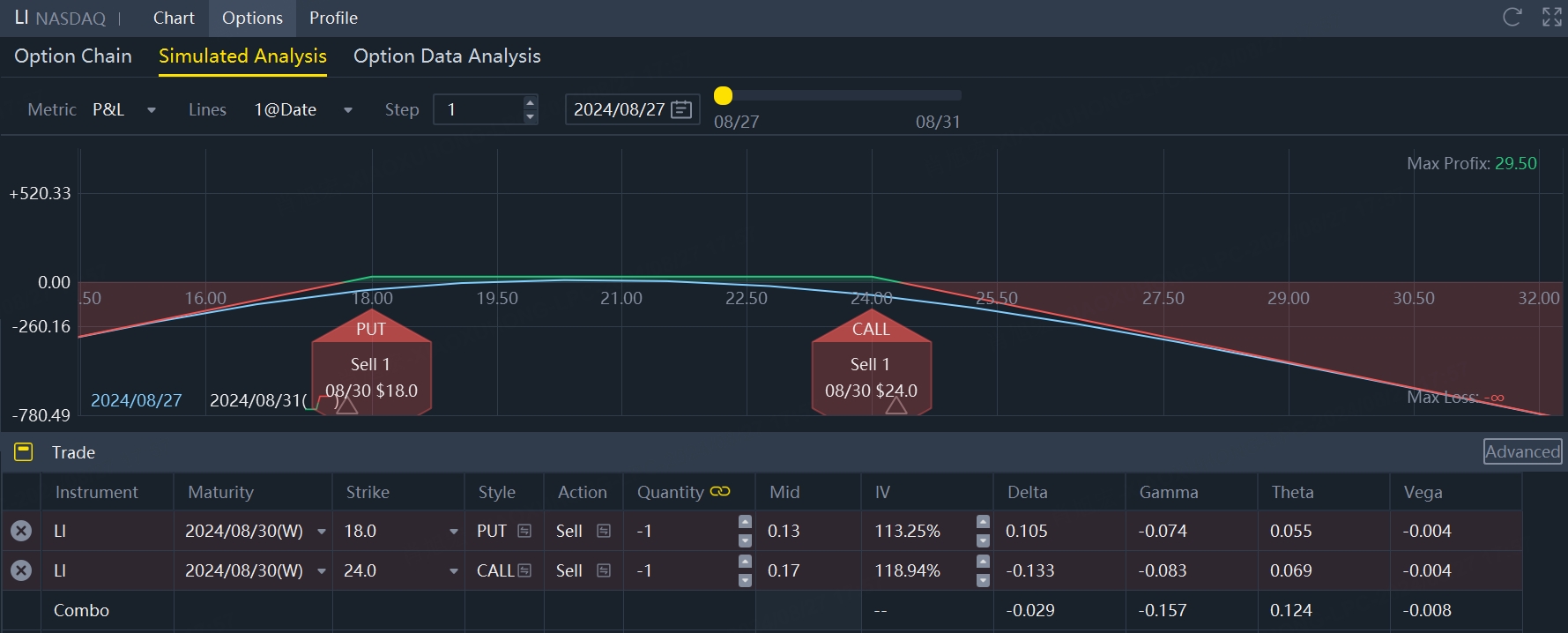 Based on historical volatility, we can bet that Li Auto’s stock price post-earnings will be between $18 and $24. We can set up a strangle option strategy by selling the following options: