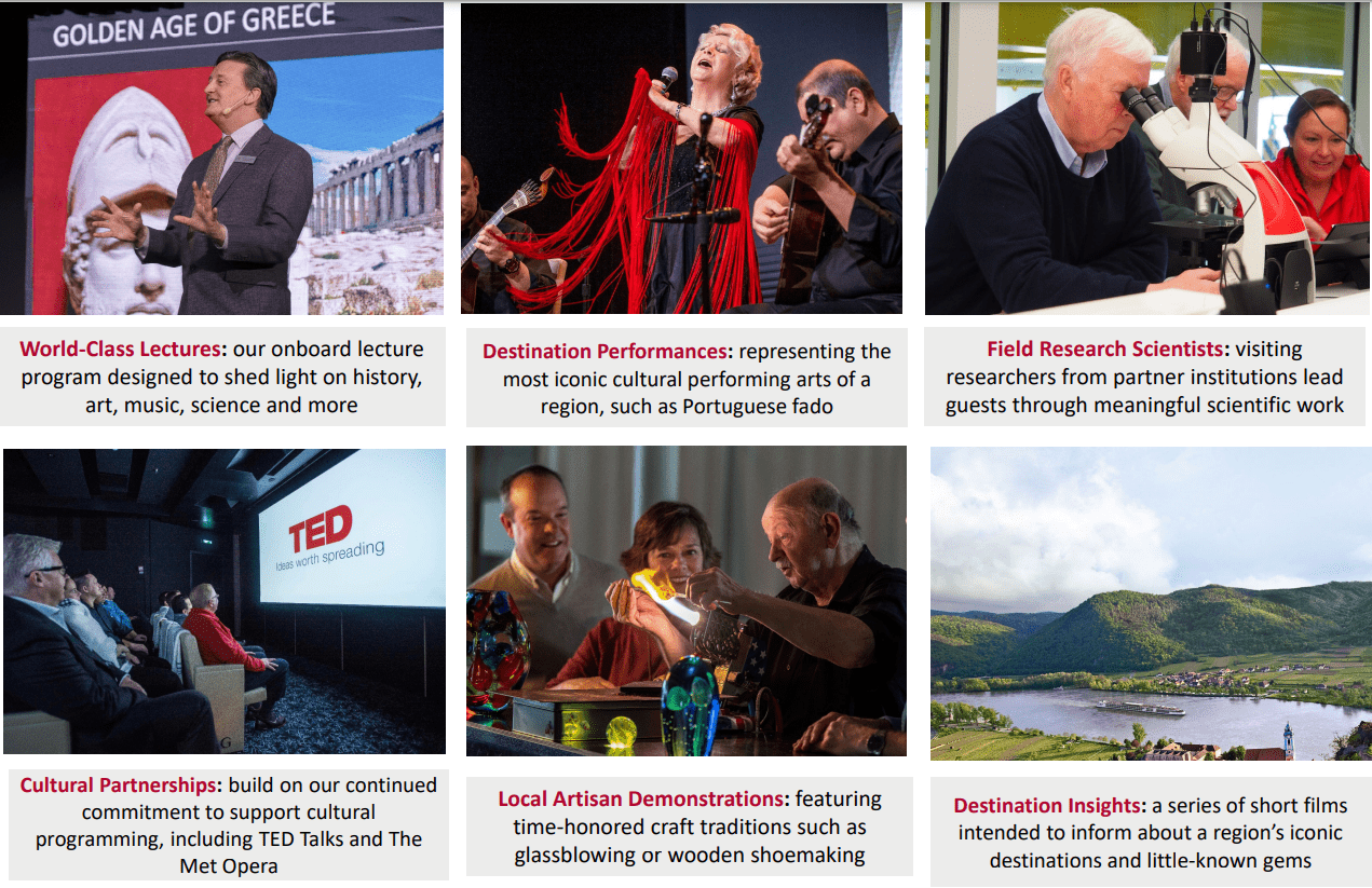 One thing that sets this company apart from other cruise companies is that it operates smaller ships and its cruises tend to be more of a cultural and learning experience for a different group of people who are looking for a calmer cruise experience. Typically, larger cruise companies like Carnival (CCL), Royal Caribbean Cruises (RCL), and Disney (DIS) are known to have these cruises that are very much like having a constant party and exposure to constant stimulation like loud music, light shows, colors blasting and while some people like that kind of entertainment, others prefer something calmer and more quiet, so Viking offers an alternative for these types of people who would rather have a relaxing experience than partying experience. The company's cruises also offer a lot of educational experiences, cultural learnings, and seminars offered by experts in different fields where people can gain exposure to their favorite topics of curiosity.