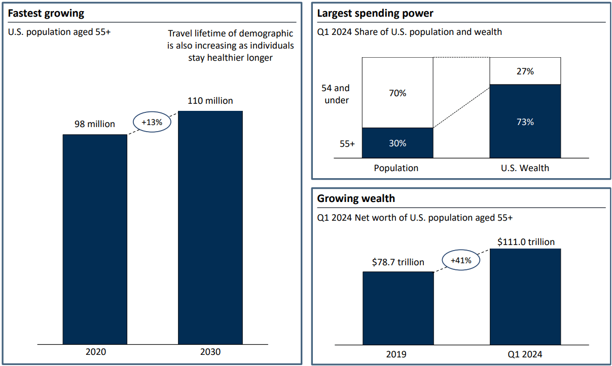 The company's target audience of people aged 55+ also happens to be the fastest-growing population segment in the US, and they tend to have the highest spending power and more wealth than any other age group. This is likely because they have been around for longer and had more experience and opportunities to amass wealth over the years. Think of it like this, if you started investing into your 401k when you were in your 20s or early 30s, by the time you are 55 years or older, you will have had a significant amount of growth in your portfolio due to 20-30 years of compounding which will allow you to have a more comfortable life. Currently, 55+ year old demographic makes up only 30% of the US population, but they hold 73% of all wealth and their net worth collectively rose from $79 trillion to $111 trillion in the last 5 years. Of course, part of this was because the average 55+ year-old got wealthier, but that's not the only reason. Another reason is that more people entered into this demographic group in the last 5 years, which means the collective wealth of this group rose by having more people in it. In the next 5-10 years, we can expect these numbers to grow even further as more people enter in this age group and older people are expected to live longer due to advances in medicine.