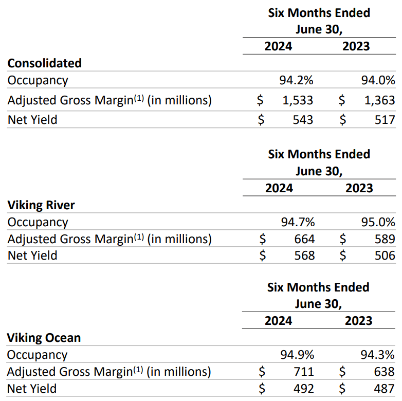 In the first 6 months of 2024, the company's cruises had an occupancy rate of 94.2% up from 94.0% from the previous year. River cruises actually saw occupancy drop a bit from 95.0% to 94.7% but ocean cruises made up for it. Even though occupancy rates rose only slightly, gross margins and net yield (profits) were up significantly, indicating that the company was able to charge its customers higher prices and people were fine with it. Total adjusted gross profits rose from $1.36 billion to $1.53 billion, an increase of 12%, and operating profit (net yield) was up from $517 million to $543 million, which is an increase of 5%. Operating income in the river cruises segment rose by more than 10% (up from $506 million to $568 million) but the same metric was flattish for the ocean segment (up slightly from $487 million to $492 million) indicating that there might be more pricing power in river segment than the ocean segment. Notice that occupancy in the river segment dropped slightly but resulted in bigger profits, while occupancy in the ocean segment rose slightly but resulted in flattish profits.