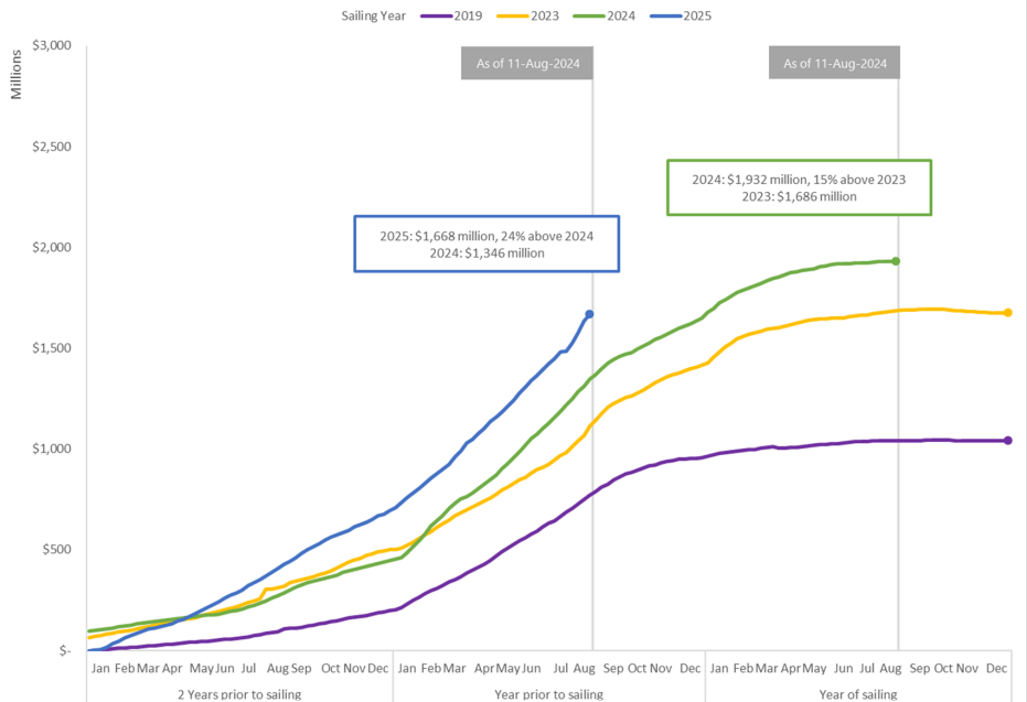 As a matter of fact, current trends of advanced bookings are already well ahead of any year since 2019. If this trend continues, 2025 will be the highest year ever in the history of the company both in terms of capacity offered, capacity sold, and total revenues. Since the company is increasing its capacity by 12% and expecting a 20% growth in total bookings, we can surmise that it is in the process of raising prices by about 8% between now and next year, but this doesn't seem to be slowing people down from booking cruises from this company.