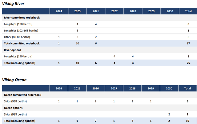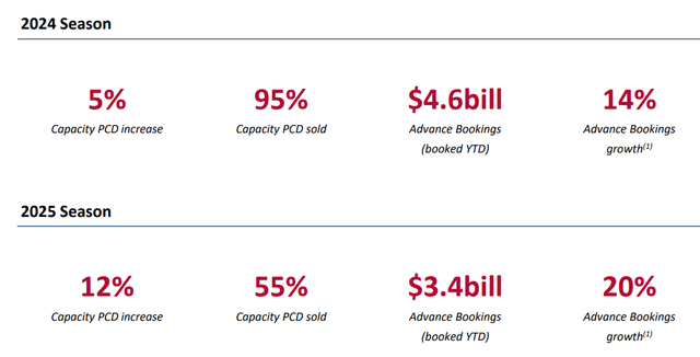 The company's forward guidance calls for a lot of growth in the next year or so. For the year 2024, it already sold 95% of all capacity as well as selling 55% of capacity for the 2025 season. By the end of this year, the company expects to have 14% growth in advance bookings, followed by another 20% growth in 2025. Keep in mind that the company expects a capacity growth of 12% for 2025 as new ships will be delivered, and it will have more cruises to sell, but even with this, the company expects to fill this capacity almost entirely by next year.