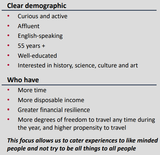 Because it offers a different type of experience that includes a more relaxed environment, the company's target audience also shares a more or less common demographic. These people tend to be 55 years or older, more affluent than average, well-educated with a strong interest in history, science, culture, and art, and more likely to be retired so they have more time and more disposable income. Many of the customers of the company are repeat customers who do their cruises year after year.