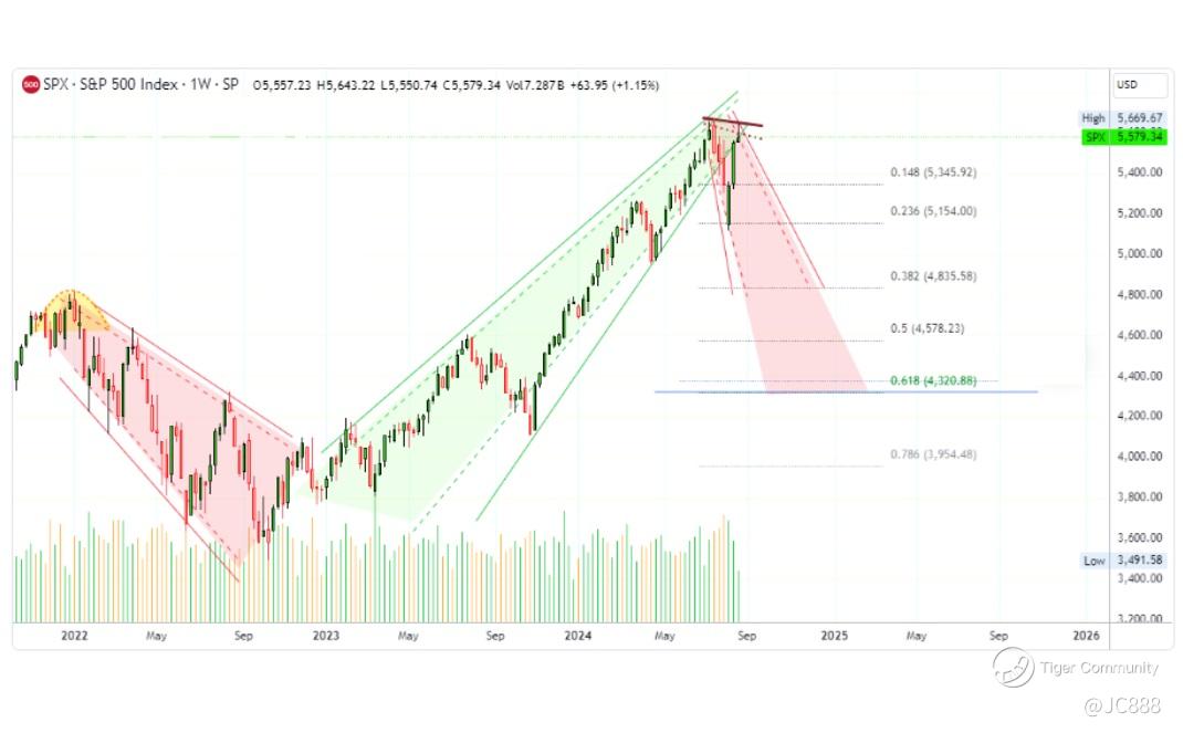 Additionally, with the S&P 500 currently hovering near the 0.236 Fibonacci retracement level, Santana predicted a potential decline towards the 0.618 retracement level, around the 4,320 mark.