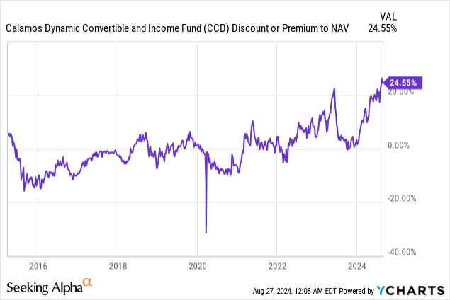 The fund currently pays a distribution of 9.8% which is within the ballpark of its typical yield of 10% which can go to as high as 12% when the fund is not trading at a NAV premium. You may be wondering how the fund can afford to pay such high yields while only collecting near 0% yields from its convertible bonds, and the answer is that it comes from capital gains. The fund pays about 10-12% of its NAV every year, regardless of whether it posts a profit or not during the year. This will probably work out fine and will be fully covered during a bull market like the one we've been enjoying for the last 15 years or so but could result in significant NAV decay during turbulent times. This is why stock valuations are very important for this bond fund.