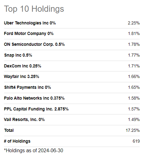 Secondly, equity prices themselves are also at a huge premium right now. The Nasdaq index is currently trading at a P/E of almost 35, which is the highest level it's been in the last 20 years. This introduces additional risk for this fund. Those of you that aren't familiar with this fund might be scratching your heads, wondering what tech stock valuations have to do with performance of a bond fund. Well, convertible bonds have more to do with stock prices than they have to do with the bond market. Convertible bonds are a special kind of corporate bond that are due to convert to stocks at a certain level. Since they can claim most of the upside in stocks while claiming almost none of the risks associated with the stock (by design), they tend to have a much lower yield as compared to other corporate bonds, sometimes as little as 0%. Corporations love these bonds because it allows them to issue debt at very cheap prices (in terms of interest rate) but it could also mean that their stock will get diluted if those bonds get converted to shares. When we look at CCD's top holdings, we see several bonds that yield either nothing or next to nothing, such as 0% yielding bonds from Uber (UBER), Ford (F) and 0.5% yielding bonds from Snap (SNAP).