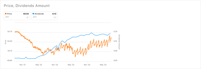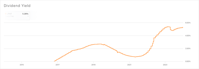 No payment has been made yet and the first might not tell investors much as it could be a partial monthly payment. As a guide, the JPMorgan Ultra-Short Income ETF (JPST) currently yields 5.26%. My concern is what that could drop to if rates take a 200-300bps hit based on how the past yield on the JPST ETF.