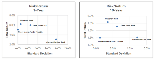 As a low-risk assets class, ultrashort funds meet that test, as shown in the next set of charts; only money-market funds had less risk in either time period.
