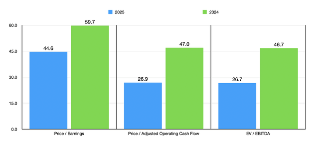 Using these estimates, as well as historical figures for 2024, we can see how shares of the company are valued in the chart above. Thanks to the anticipated growth and the fact that the company has net cash on hand of $18.7 million, the forward EV to EBITDA multiple is no longer at atmospheric levels. The same holds true of the price to adjusted operating cash flow figure. But even on this basis, shares are very pricey.