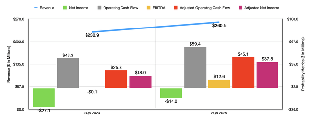 Speaking of cash flows, the firm did see a decline year over year from $12 million to only $5 million. But if we adjust for changes in working capital, we get a near doubling from $12.8 million last year to $21.4 million this year. Meanwhile, EBITDA for the company improved from negative $2 million to positive $1 million. In the chart above, you can also see financial results covering the first half of 2025 compared to the same time of 2024. As was the case for the second quarter on its own, the first half of this year looks meaningfully better than it did for the 2024 fiscal year.