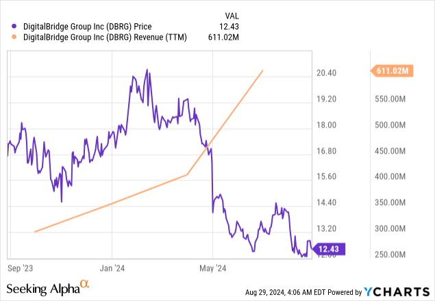 - DigitalBridge's share price has slid by more than 25% despite its revenues increasing rapidly over the last year.