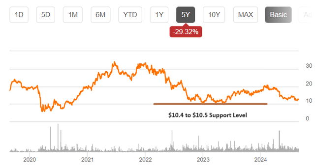 In the meantime, with the share price trading well below the 50-day, 100-day, and 200-day moving averages, there may be further downside, possibly to the $10.4 to $10.5 support level as shown below. This could constitute an opportunity to buy.