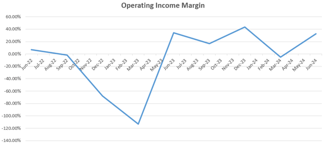 The broader picture covering the last eight quarters as per the chart below shows revenues and operating income fluctuating widely with the company returning a loss on two occasions. Also, despite revenues surging by 316% in the March quarter (1Q24), it suffered from a loss.