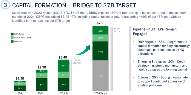 Thus, more risk-aware investors may want to wait for DRBG to achieve its capital formation target for the rest of this year. In this respect, it has already raised $3.48 billion as of July but plans to raise $7 billion in total within the balance of this year as shown below. Its ability to achieve this target while seeing oversubscriptions to its funds, as has been the case in the past, would demonstrate sustained engagement from its pipeline of Limited Partners (LPs).