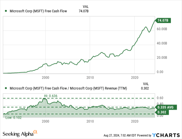 Now, let’s provide a little more context to these numbers. For starters, the free cash flow is the highest it has ever been. And in the case of Microsoft, free cash flow is constantly increasing, but there is some risk we are close to a cycle peak and lower free cash flow in the next few quarters is certainly a possibility.