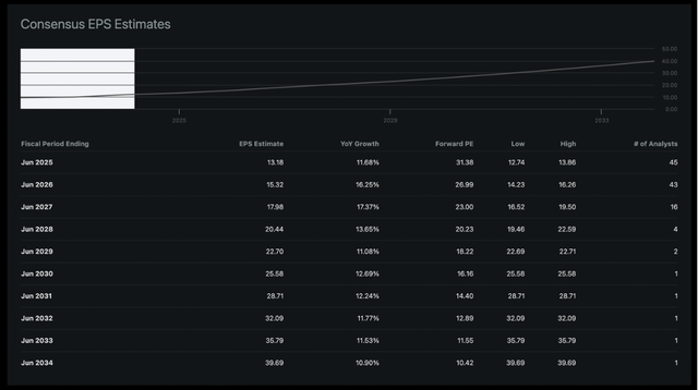 On the other hand, we should not ignore that analysts are still extremely optimistic for the years to come. Over the next ten years, analysts are expecting revenue to increase with a CAGR of 11.50% and revenue will increase from about $245 billion right now to almost $730 billion in fiscal 2034. And when looking at estimates for earnings per share, analysts are expecting the bottom line to grow with a CAGR of 12.90% over the next ten years.