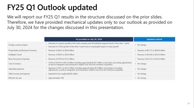 And as a consequence of the new reporting structure, Microsoft also updated its guidance for the first quarter of fiscal 2025. Overall revenue estimates remain the same, but of course, the estimates for the three different segments changed.