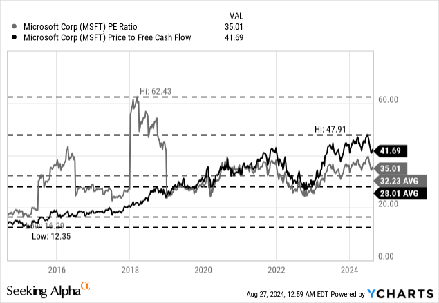 One of the major reasons for me being rather cautious in the last few quarters was the stock price we must pay for Microsoft and the valuation multiples the stock was trading for. And when looking at the valuation multiples right now, the picture did not really improve. At the time of writing, Microsoft is still trading for 35 times earnings as well as 42 times free cash flow. Both metrics are not only above the 10-year average (32.23 for the P/E ratio and 28.01 for the P/FCF ratio) but are high valuation multiples on an absolute basis.