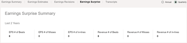 However, this target could be exceeded, resulting in the company beating analysts' consensus estimates as has been the case eight times out of eight during the last two years, as shown below.