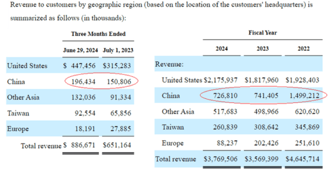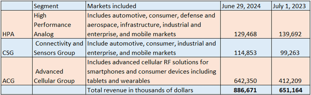 Thus, sales from the East Asian country increased by nearly 30% YoY or from $151 million to $196 million during FQ1 compared to a decline for fiscal 2024 as shown below with Qorvo managing to expand its customer engagements to include four 5G Android OEMs (original equipment manufacturers) with the associated shipments starting this year.