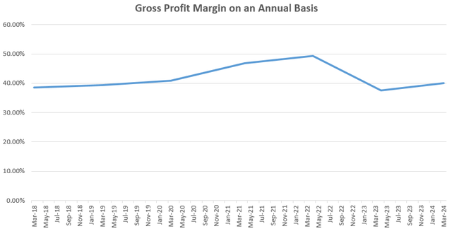 The revenues of $887 million represented a 36% YoY increase, while gross profits improved only by 34%. Looking at the broader picture in the chart below, 47% and 49% margins for fiscal years 2021 and 2022 respectively slid to 37.6% in fiscal 2023 before recovering to slightly above 40% in fiscal 2024 which ended in March.