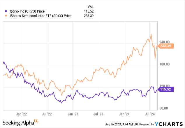 Qorvo's (NASDAQ:QRVO) share price has dipped from mid-July alongside the iShares Semiconductor ETF (SOXX) as shown in the chart below. However, unlike the ETF which benefited from its artificial intelligence holdings, the stock has not recouped the losses suffered after the Federal Reserve aggressively hiked interest rates in 2022.