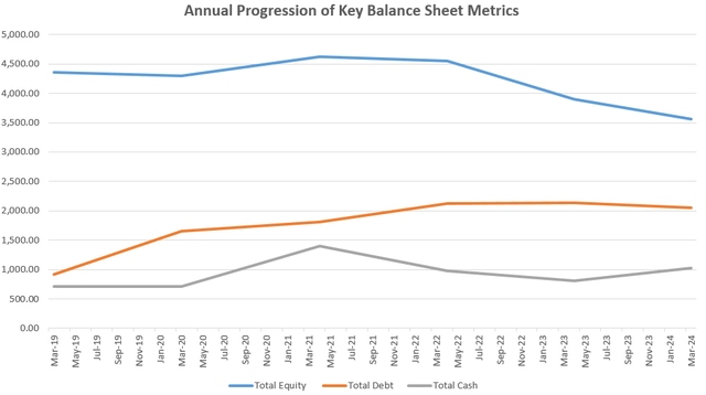 There is also a high probability of monetary conditions easing in Qorvo's biggest market, where recession risks have receded. Now, one of the reasons the company was hit hard in 2022 (as per the introductory chart) if its debt was on the rise while cash on hand was trending lower. Two years later, progress has been made on both metrics while total equity is on a downtrend indicating less issuance. Therefore, it is well-positioned to benefit from a more dovish Fed.