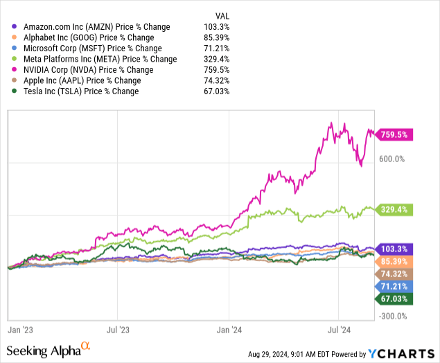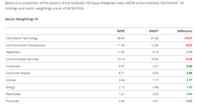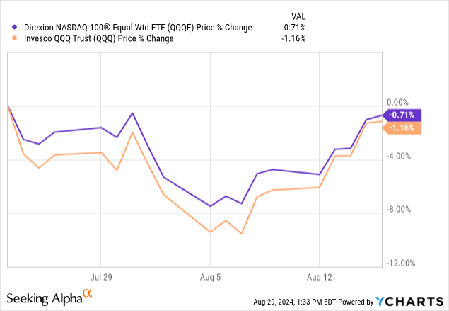 Emphasizing the diversification rationale, by investing in QQQE instead of QQQ, the idea is to remain invested in tech and AI but in a less concentrated way while gaining exposure to a wider spectrum of stocks, which carry more weight across sectors other than IT. On a cautionary note, this diversification approach has meant lower returns as shown by the one-year price performance above, but this period covered the bull market where those involved in supplying the chips and building AI infrastructure outperformed. However, as seen in July and more recently by NVIDIA’s stock volatility in the aftermath of earnings, Mag 7 has lost its luster.