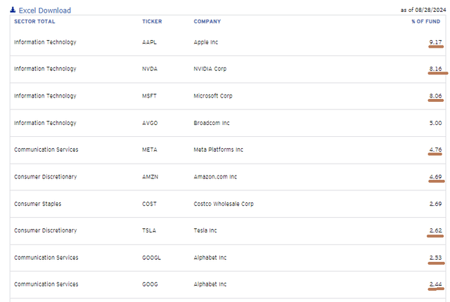 Top holdings with Mag 7 stocks underlined in brown (www.direxion.com)