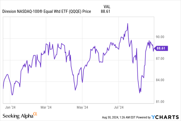 Since I last covered the Direxion NASDAQ 100 Equal Weighted Index Shares ETF (NASDAQ:QQQE) in my bullish thesis on December 20 last year, it has returned nearly 6.75% and is trading at $88.6 as shown below. While this is not a significant gain, it still shows the rotation away from the Magnificent 7 (Mag 7) group has started, as I detail further.