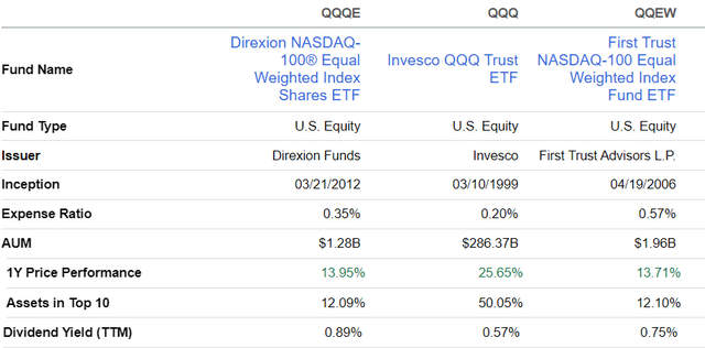 Looking across the ETF space for an alternative, there is also the First Trust NASDAQ-100 Equal Weighted Index Fund ETF (QQEW) but it comes with a higher expense ratio and pays less dividend.
