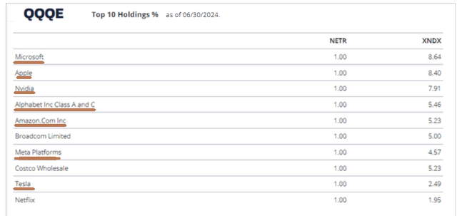Moreover, over 50% of its weight is concentrated in its first ten holdings as shown below, compared to only 12% for QQQE. With an equal-weighted approach and tracking the NASDAQ-100 Equal Weighted Index or NETR, the Direxion ETF mitigates risks by more evenly spreading its assets across its holdings.