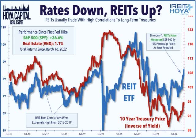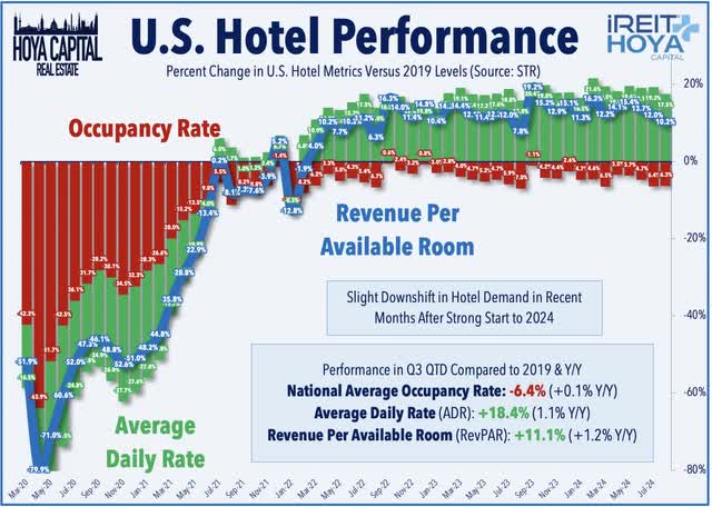 Hotel: Park Hotels (PK) advanced 1% this week after it reported that its two Hawaii-located hotels "sustained no material damage" from Hurricane Hone, a Category 1 hurricane that impacted the Hawaiian Islands last Sunday. Hotel data provider STR reported this week that industry-wide Revenue Per Available Room ("RevPAR") was flat on a year-over-year basis in July, continuing a trend of moderation in recent months after a strong start to 2024. This level of RevPAR was 12.0% above pre-pandemic 2019-levels, however, as cumulative room rate inflation (Average Daily Rates) of nearly 20% during this time has helped to offset a 6% drag from lower occupancy rates. Recent weekly data indicates that August is shaping up to be a stronger month, with RevPAR trending to be 2.4% above last year. TSA Checkpoint data shows similar trends of softness in July followed by a rebound in August. Domestic throughput cooled to around 4% above 2019-levels in July - the softest month since mid-2023 - but has rebounded thus far in August to roughly 8% above 2019-levels. Hotel REITs were among the "losers" of REIT earnings season, as ten of the eleven hotel REITs lowered their full-year RevPAR outlook.