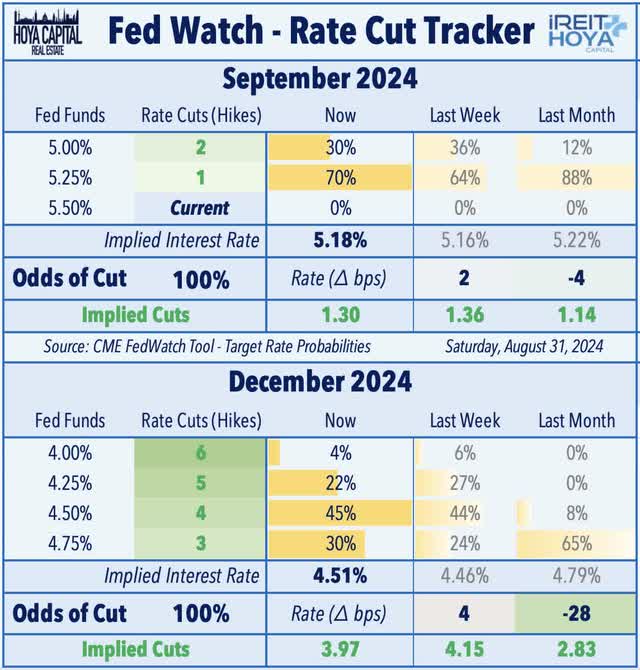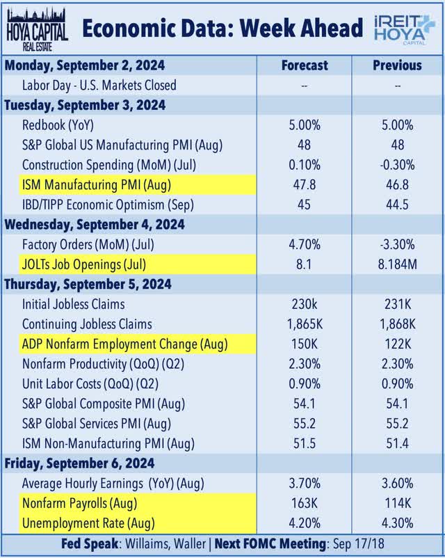 U.S. equity markets climbed to the cusp of record-highs while benchmark interest rates rebounded modestly from eight-month lows on a relatively quiet end-of-summer week as investors parsed a "Goldilocks" slate of economic data showing modest inflationary pressures alongside resilient consumer activity. Posting gains for a fourth week following a three-week skid in late July, the S&P 500 gained another 0.3% this week - lifting the major benchmark to back within 0.2% of all-time record-highs - while the Dow Jones Industrial Average closed the week at fresh records. Tech stocks were laggards this week, however, with the Nasdaq 100 slipping 0.8% after earnings results from chip giant Nvidia were softer than lofty expectations. Real estate equities continued their recent outperformance this week on indications that the rate retreat will spark a revival across the long-floundering REIT sector. The Equity REIT Index advanced 0.4% this week, with 15-of-18 property sectors in positive territory, while the Mortgage REIT Index gained 1.4%.