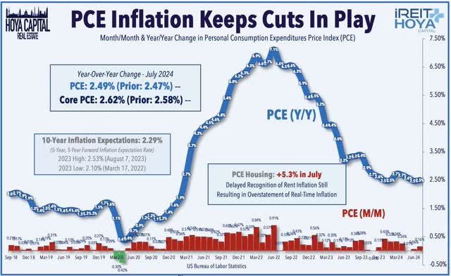 Following cooler-than-expected Consumer and Producer Price Index data earlier this month, PCE Price Index data this week provided further evidence of modest inflationary pressures in July, keeping the Federal Reserve on course for multiple rate cuts in the final months of 2024. Headline PCE rose 0.2% for the month - in line with expectations - which maintained the year-over-year increase at 2.5%, matching the lowest level since February 2021. Core PCE - the Fed's preferred gauge of inflation - also rose 0.2% in July - matching expectations and keeping the annual increase unchanged from the prior month at 2.6%. The report was a bit more encouraging under the surface, as Core PCE ex Housing increased just 0.1% on the month. We've noted that real-time shelter inflation - as measured by a half-dozen private market data providers - is closer to the 0-2% range, far below the 5.3% increase reported in government data. Substituting the Apartment List National Rent Index (ALNRI) for the PCE Housing component shows that Headline PCE has averaged less than 2% this year.