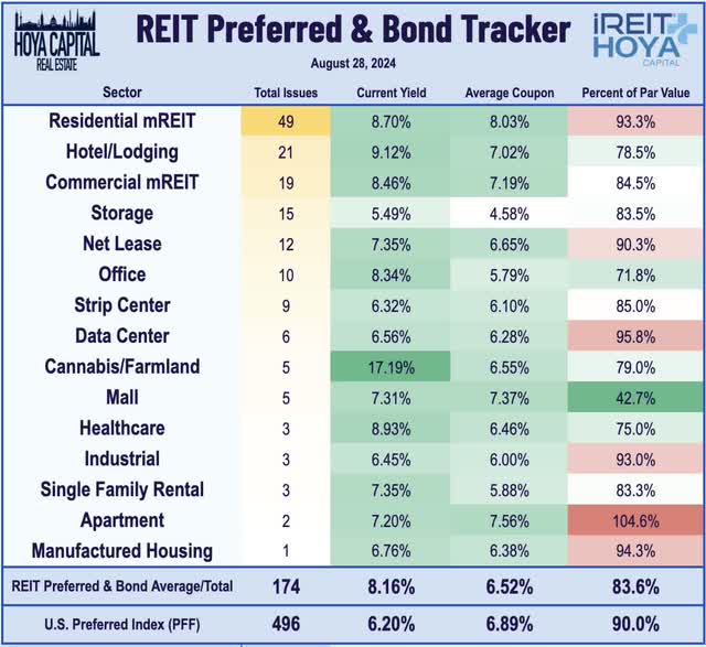 Net Lease: REITs remained busy on the capital raising and "capital recycling" front this week as well. Realty Income (O) - the largest net lease REIT - gained 2% this week after it announced that it raised nearly $1B in new debt capital and noted that it would redeem its lone outstanding preferred share class, which was a residual from the Spirit Realty merger in 2023. O raised a combined £700M ($933M) in debt, pricing a public offering of £350M of five-year notes due 2029 at a 5.00% interest rate, and £350M of seventeen-year notes due 2041 at a 5.25% interest rate. Concurrently, Realty Income announced that it would redeem all 6.9M outstanding shares of its 6.0% Series A Preferred (O:PR), formerly the Spirit Realty Series A Preferred. The shares will be redeemed at $25.00 per share, plus accrued and unpaid dividends to Sep. 30. The total payment will come to $25.375 per share. The shares had traded as low as $19.70 last October prior to the merger announcement. After the redemption, there will be 173 exchange-listed REIT preferred securities, which trade with an average current yield of 8.16%, and trade with an average discount to par value of roughly 15%.
