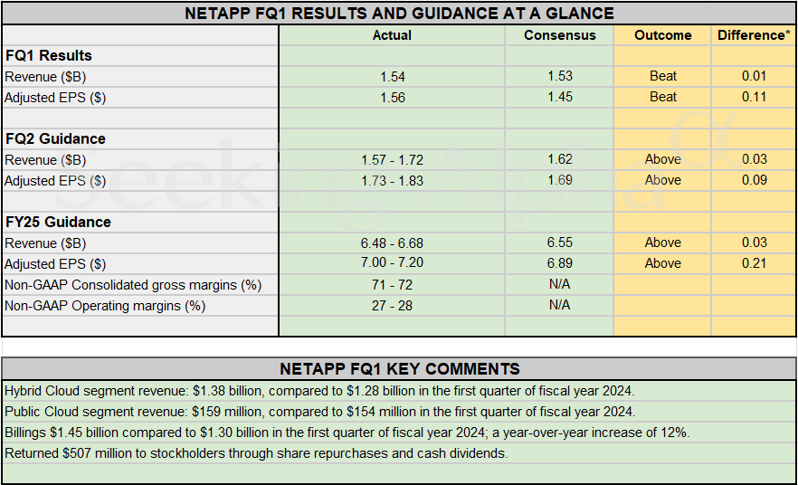 The following chart outlines NTAP's results and guidance from 1QFY25.