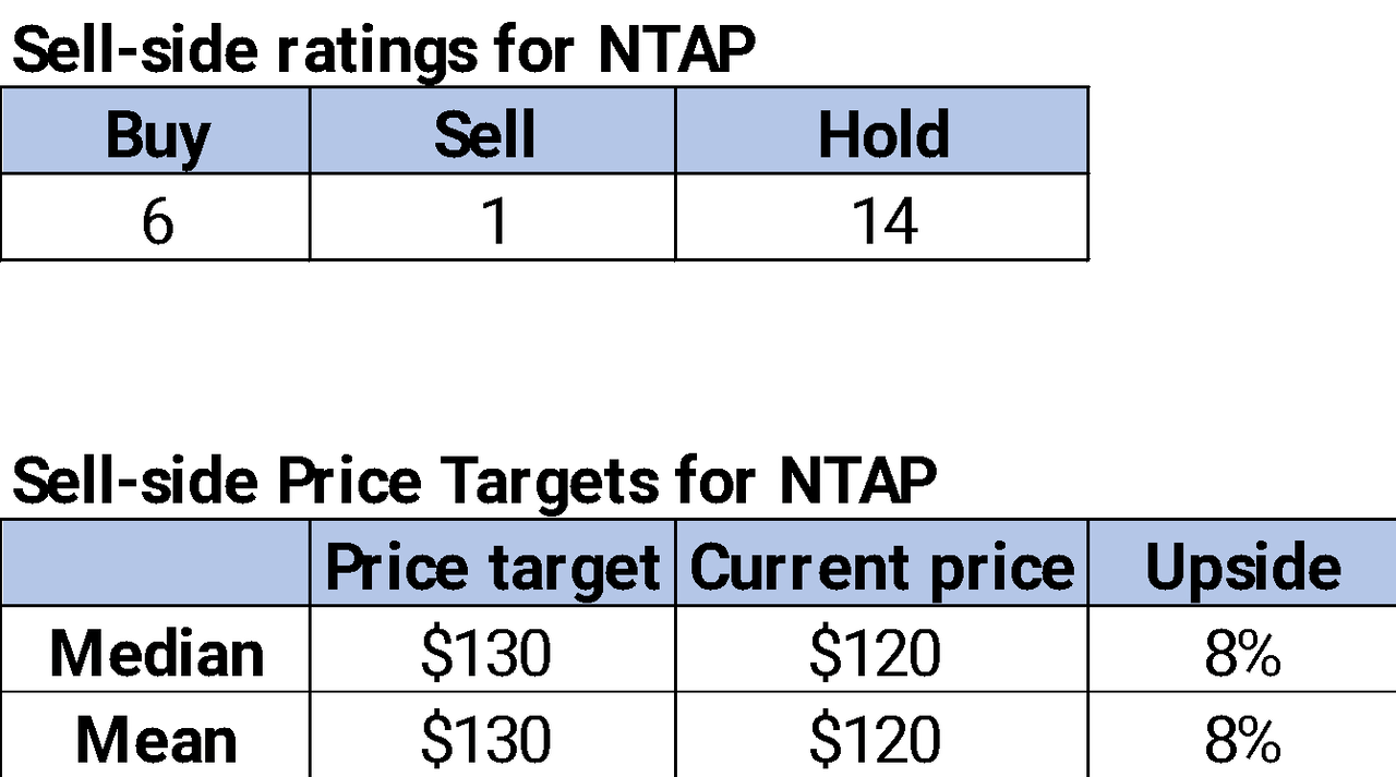 Wall Street shares our more cautious sentiment on NTAP. Of the 21 analysts covering the stock, six are buy-rated, 14 are hold-rated, and the remaining one is sell-rated; interestingly, this is the exact same as it was at the time of our December note. Turning to the sell-side price targets, the stock is priced at $120 per share, with a median and mean price target of $130 for a potential 8% upside.