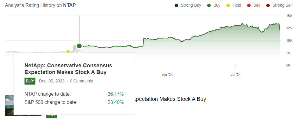We're downgrading NetApp (NASDAQ:NTAP) to a hold as we think the positives from the memory/storage recovery have been priced into the stock, with the stock valued near historical highs. We last upgraded NTAP to a buy when the stock was trading at $91 per share last December; now, the stock is trading at $120 and reached a high of ~$135. We think our positive thesis of NAND flash strength and demand recovery played out, driving NTAP's outperformance over the past three quarters. Over the past four quarters, NTAP has beaten EPS estimates three times, and revenue estimates four times at the same time that memory prices recovered in 1H24, confirming our belief that the positives from the demand-supply regaining balance and price recovery have been priced into the stock. We downgraded Micron (MU) earlier this month, and now NTAP follows.