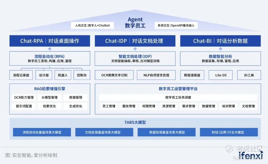 實在智能基於TARS大模型,已構建三款AI Agent。①Chat-RPA:具備數字員工發現、構建、應用、管理等能力,支持用戶以對話方式實現桌面操作。②Chat-IDP:具備文檔智能抽取、審覈、比較模型訓練等能力,支持用戶以對話方式實現文檔處理。③Chat-BI:具備數據採集、存儲、管理、應用等能力,支持用戶與對話方式實現數據分析。