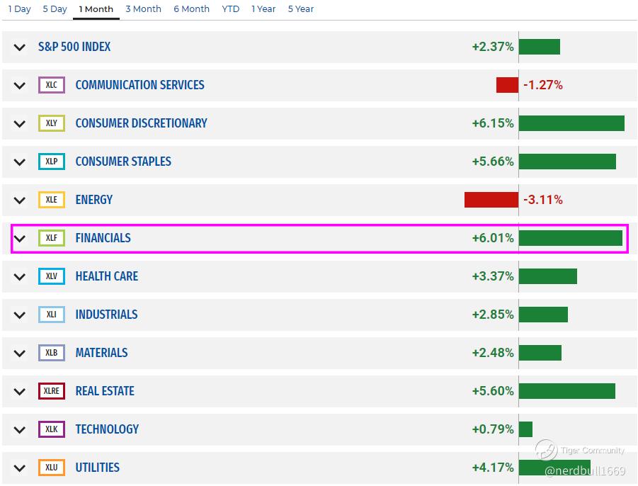 One of them is XLF which has a +6.01% gain over the one month period. This is the ETF fund we can considered for this sector $Financial Select Sector SPDR Fund(XLF)$