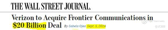 On Wed, 4 Sep 2024 - $Frontier Communications Parent Inc.(FYBR)$ gained +1.51%, after The Wall Street Journal (WSJ) reported that $Verizon(VZ)$ was in advanced talks to acquire the Dallas-based fibre provider. (see below)