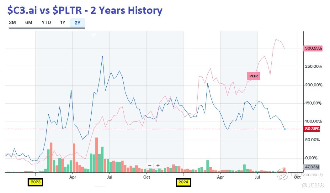 C3.ai and $Palantir Technologies Inc.(PLTR)$ , both prominent players in the AI space, have had contrasting journeys on the US stock exchange since their respective IPOs: