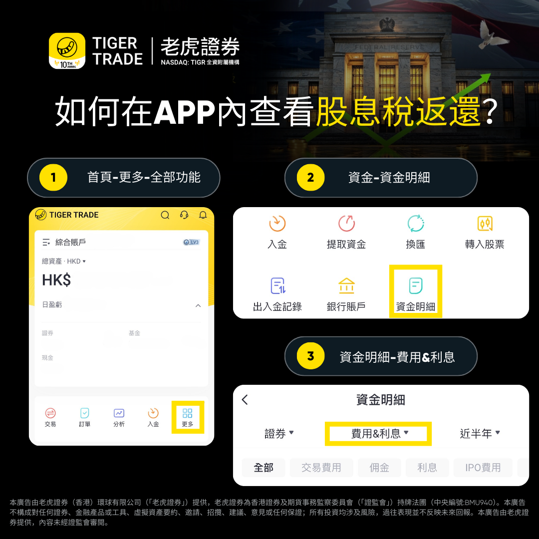 美債ETF通常持續分紅,分紅會視爲股息而被預先扣除股息稅。稅率因國家而異。但是跟股票的股息不同,美債ETF的股息稅會在第二年2-4月退回。你可以在Tiger Trade中查看退回的股息稅。