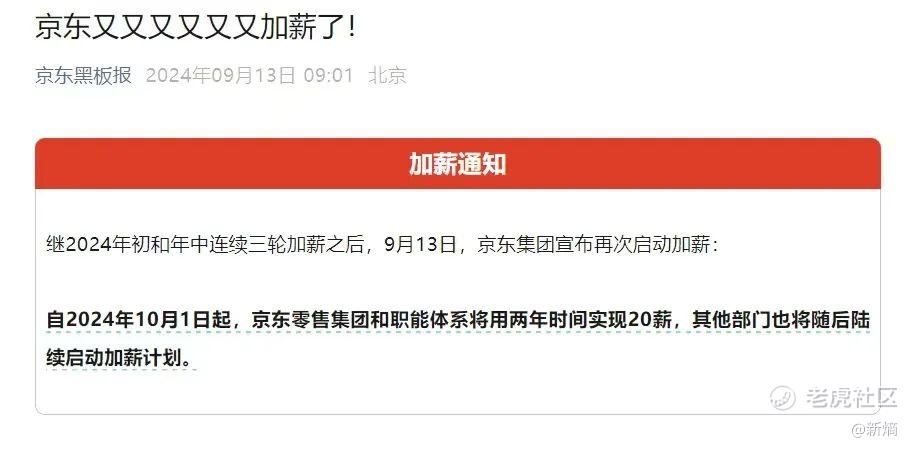 9月13日,京東集團宣佈再次啓動加薪,自2024年10月1日起,京東零售集團和職能體系將用兩年時間實現20薪,其他部門也將隨後陸續啓動加薪計劃。