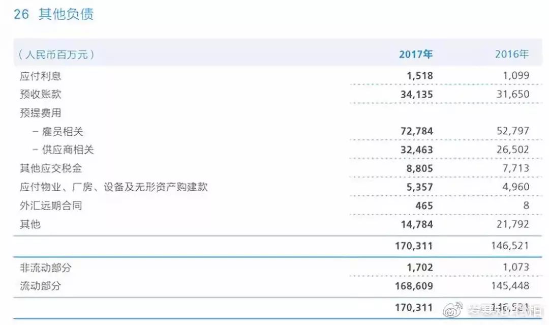 華爲的負債裏有個金額最大的欄目其他負債,高達1703億元,裏邊有728億元是預提的員工福利費用。