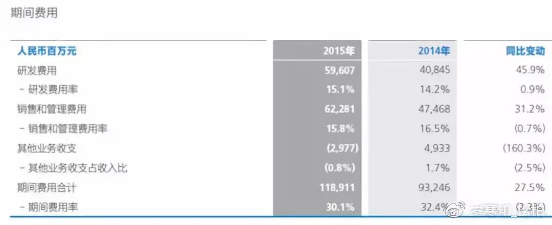 上圖爲毛利及淨利情況,看起來雖然毛利率不錯,但淨利潤率似乎並不是特別的優秀。箇中原因一是華爲員工薪酬福利計提充分保守,原因二是研發鉅額投入且增速快於收入。